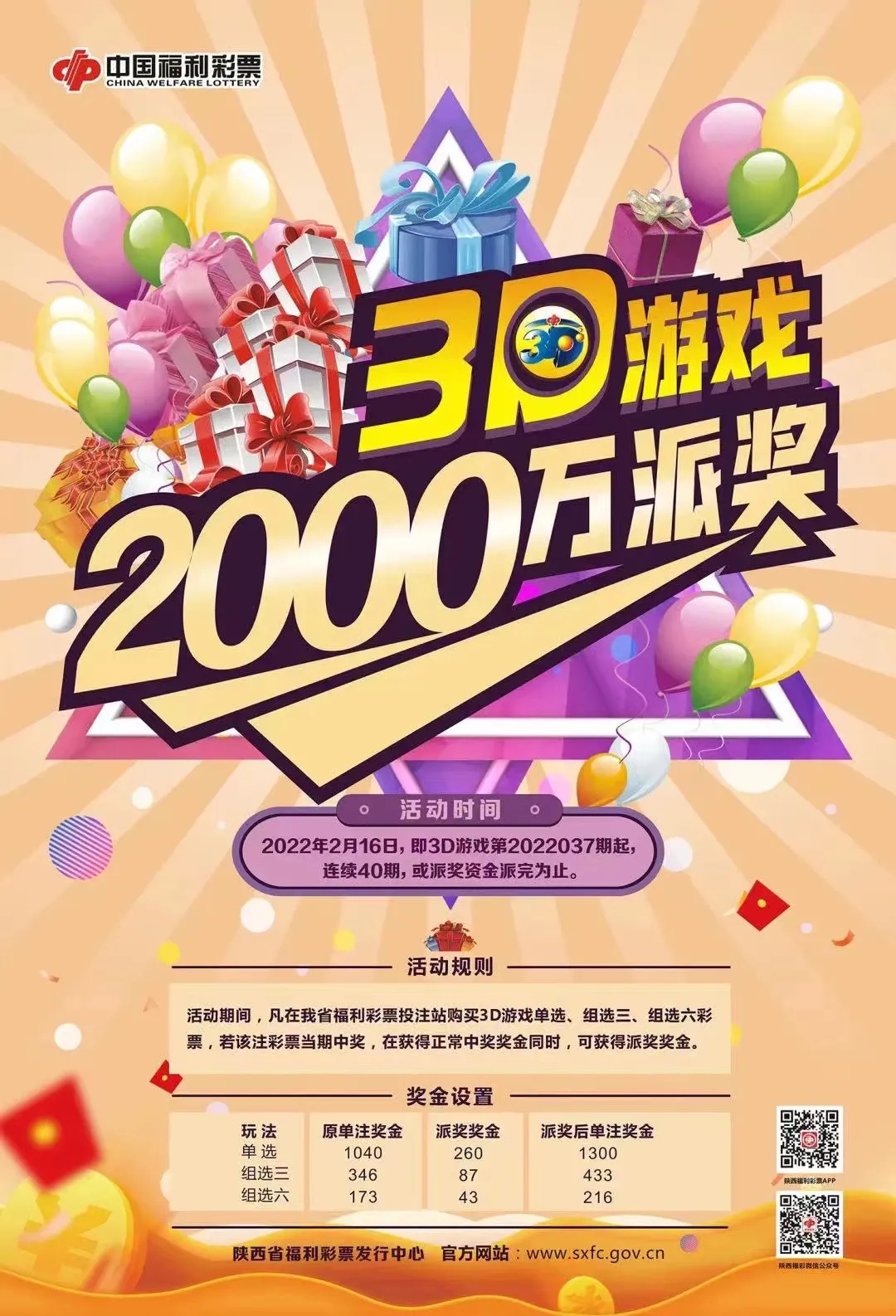活動針對3D單選、組選三、組選六3種玩法派獎,從第2022037期開始,持續(xù)40期,或派獎資金派完為止。