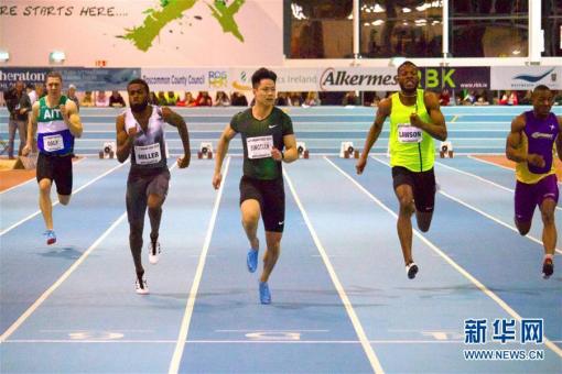 ↑2月13日,中國選手蘇炳添(中)在預(yù)賽中沖刺。 當(dāng)日,在愛爾蘭阿斯隆舉行的室內(nèi)大獎(jiǎng)賽中,中國短跑名將蘇炳添以6秒52的成績(jī)?cè)谀凶?0米比賽中奪冠并打破賽會(huì)紀(jì)……