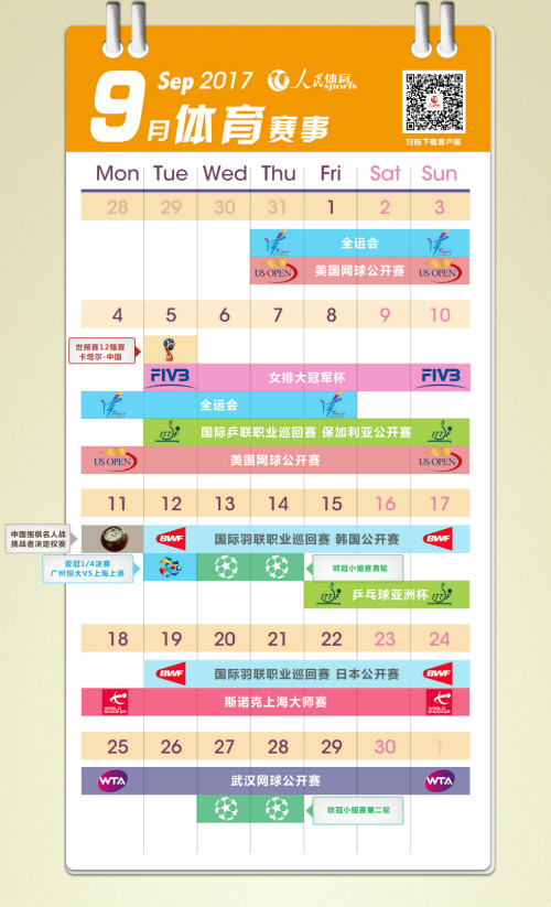 9月賽歷姍姍來遲,因為全運(yùn)會的報道,耽誤了賽歷的發(fā)布,小編在此先給您鞠個躬,致個歉。9月的重點賽事相當(dāng)多,除全運(yùn)會外,還有國足的最后一場12強(qiáng)賽,中國隊2-1擊敗卡塔爾,雖然沒能最終出線,但國足的進(jìn)步我們有目共睹,相信他們會越來越好。四年一屆的女排大冠軍杯在9月10日結(jié)束,中國女排以全勝的戰(zhàn)績奪冠,時隔16年再次捧起大冠軍杯,令人振奮;同一天,美國網(wǎng)球公開賽也落下帷幕,納達(dá)爾和斯蒂文斯分獲男女單打冠軍,恭喜他們。