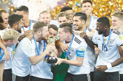 | 					  7月2日,俄羅斯圣彼得堡舉行的2017年聯(lián)合會杯足球賽決賽中,德國隊以1∶0戰(zhàn)勝智利隊,奪得冠軍。德國隊球員在頒獎儀式上捧杯慶祝。 |