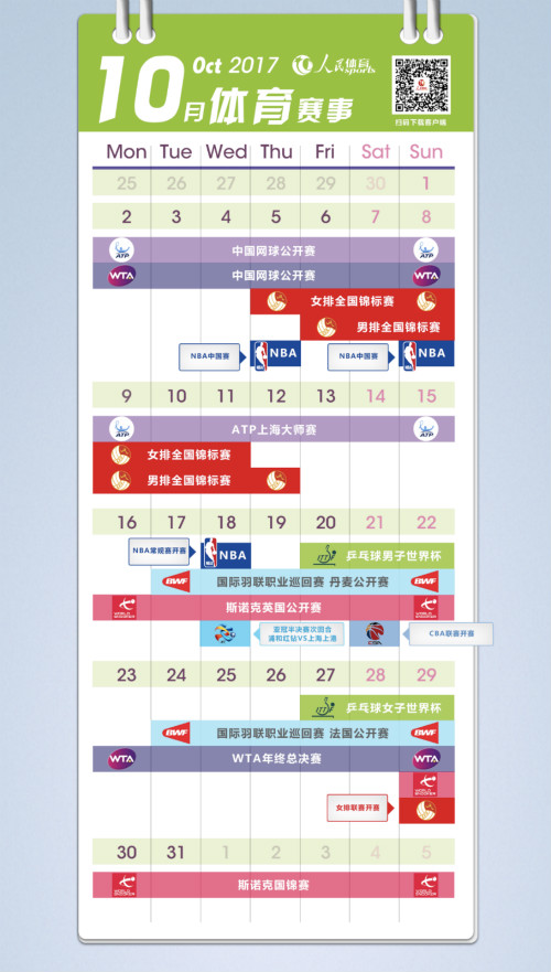 10月精彩賽事不斷,歡迎各位收藏人民體育出品的10月賽歷。