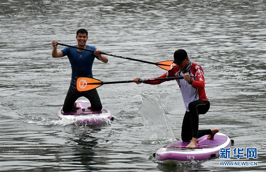 ↑11月16日,皮劃艇拔河賽選手在比賽中。 當(dāng)日,2018年福建將樂皮劃艇趣味賽在將樂縣金溪河開賽。本次比賽設(shè)皮劃艇拔河、皮劃艇接力、槳板競渡3個項目,吸引了福建、吉林等國內(nèi)120名選手參與。 新華社記者彭張青攝